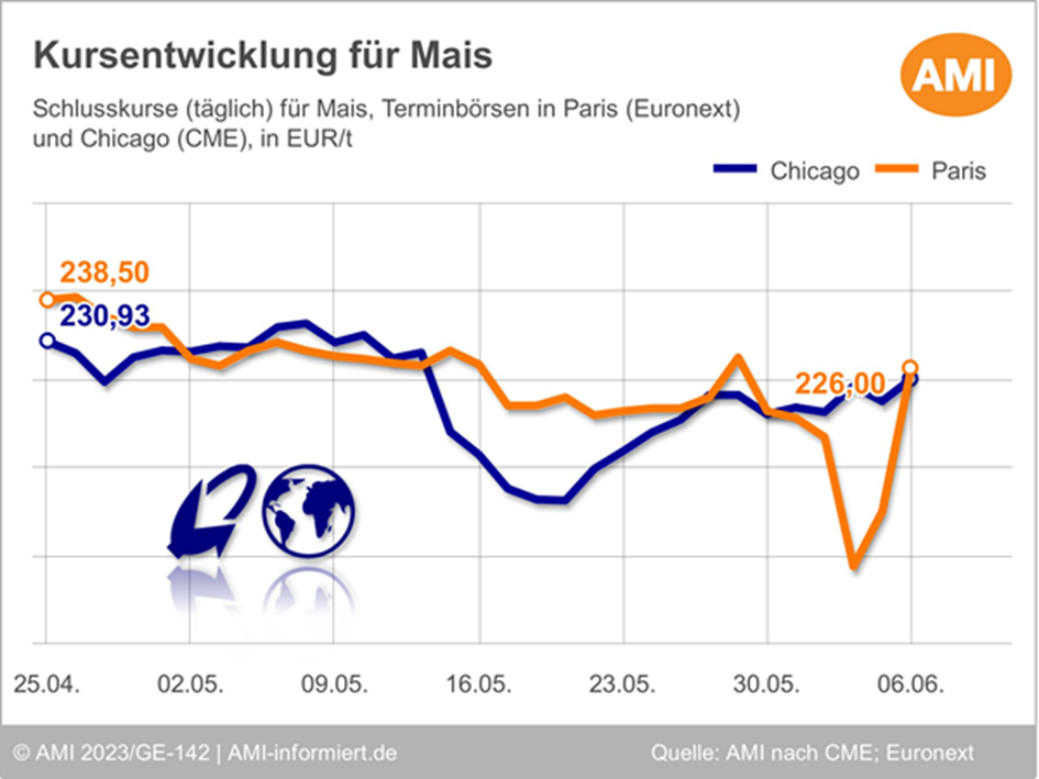 Auch die Maisnotierungen in Chicago bewegten sich im Aufwind der festen Getreidekurse nach oben, konnten ihr Niveau zwischenzeitlich jedoch nicht halten. So schloss der Fronttermin Juli 22 am 06.06.2023 bei umgerechnet 224 EUR/t und damit rund 6,30 EUR/t über dem Niveau der Vorwoche. Ausschlaggebend für die Aufwärtskorrektur waren dabei Trockenheit und Hitze im mittleren Westen der USA. Marktteilnehmer befürchten, dass diese die Maisbestände in ihrem noch frühen Entwicklungsstadium beeinträchtigen könnten. So teilte das Ministerium zuletzt mit, dass sich bis zum 04.06.2023 rund 64 % der US-Maisbestände in einem guten bis ausgezeichneten Zustand befanden, 5 Prozentpunkte weniger als noch in der Woche zuvor und 3 Prozentpunkte weniger als von Analysten im Vorfeld erwartet worden waren. (Quelle: AMI)